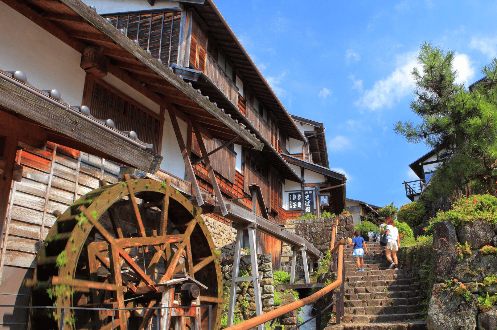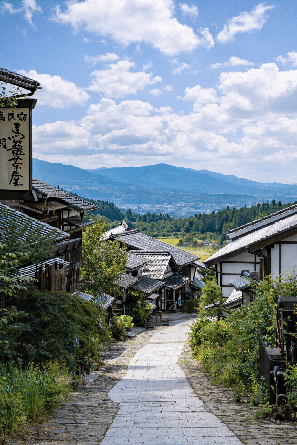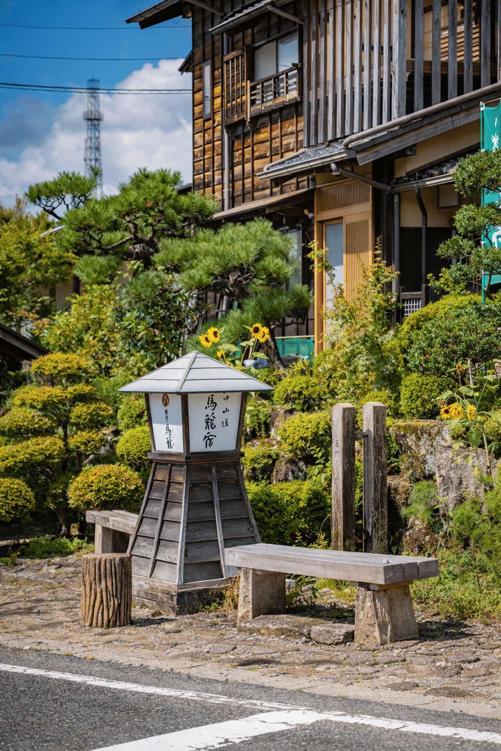 馬籠宿以石板坡道聞名,兩側是保存良好的古民家、茶屋以及老式木造房舍,