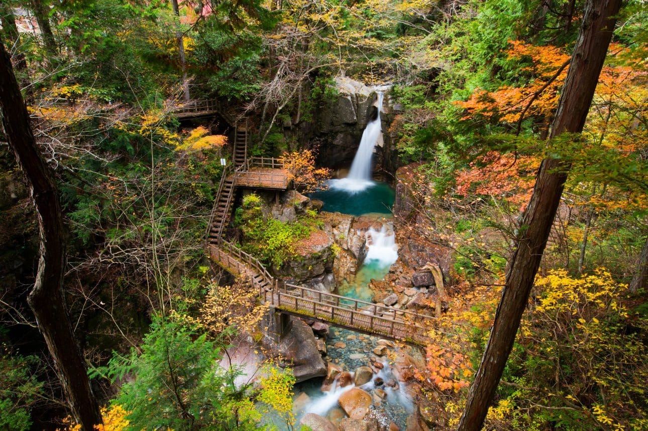 龍神瀑布隱身於山林之中,瀑布自岩壁間傾瀉而下,水流清澈透亮。周圍被綠樹包圍,空氣清新,是中山道行程中的自然亮點。